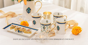 Shores of Persia is a soiree collection encrusted in 24-carat gold and hand-crafted in decadent shades of zaffre blue and turquoise. Etched on its canvas of fine porcelain is the grandeur of an epoch through floral motifs and gold-laced vines.